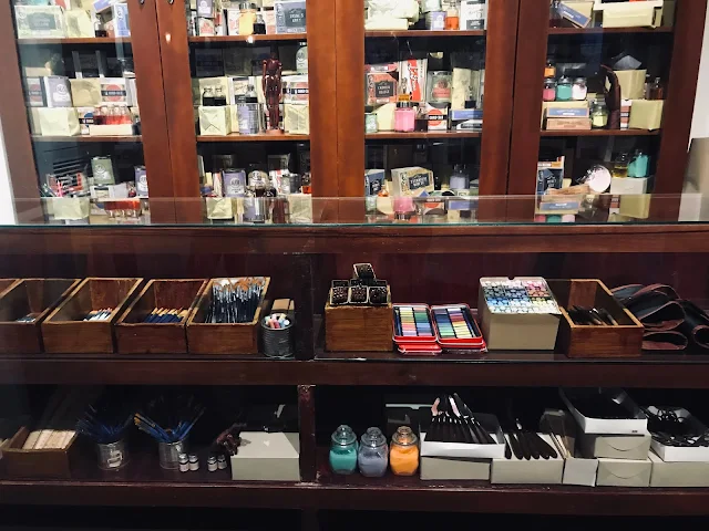 Above and below looks like a mini-hardware shop because of the presence of coloring or painting materials, match sticks, kerosene (presumably for kerosene lamps) and more.