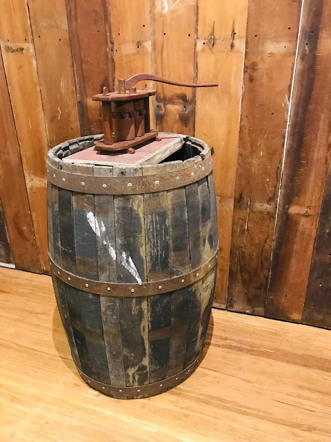 An actual barrel used to age liquor with the old school style faucet for pumping out the contents.